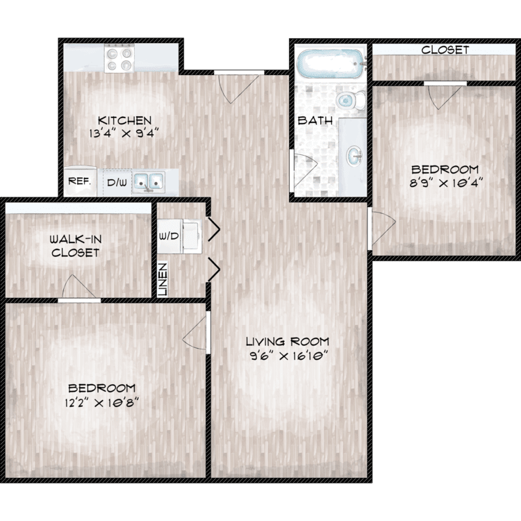 Discover The Hamilton, where studio, one, and two-bedroom apartments for rent pair natural appeal with inviting practicality. Prepare meals in a sleek, modern kitchen equipped with a complete appliance suite and a pantry in select layouts. Hard-surface flooring and carpeting, roomy closets, ceiling fans, and wall-mounted air conditioners add refined comfort throughout.